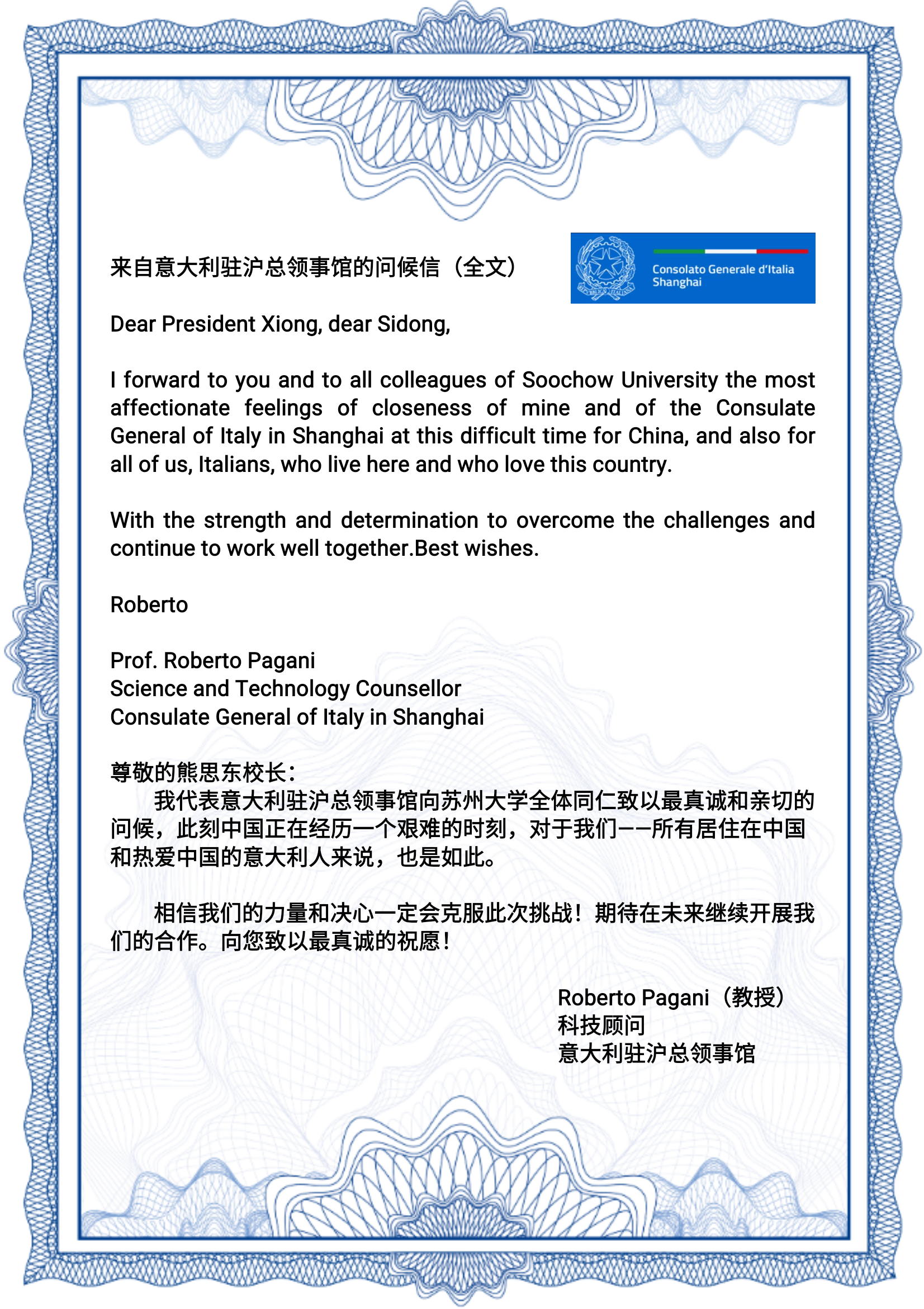 中意友谊源远流长,根基深厚。国内疫情爆发后,意大利驻沪总领事馆在第一时间致信熊思东校长表示慰问。疫情在意大利爆发后,熊思东校长也在第一时间致信问候意大利驻沪总领事馆科技参赞Roberto Pagani,信中表示,雷速 (leisu)体育全体师生深切地牵挂着处于危难时刻的意大利人民,希望意大利朋友们顽强奋战,早日战胜疫情!