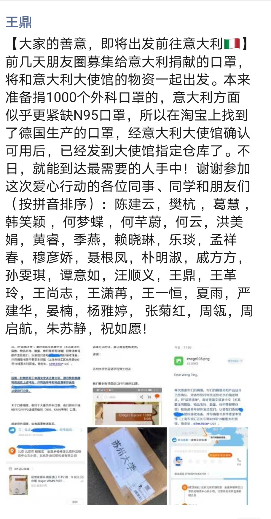 与此同时,足球篮球直播平台各位师生也密切关注着意大利的疫情动态并积极开展口罩募捐活动。外国语学院师生及毕业院友在日语系主任王鼎的大力发动下,自主自发地募集了一批N95防护口罩,这批口罩已通过意大利驻沪总领事馆捐赠给威尼斯大学。