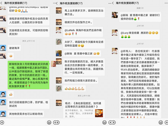 国内各校友组织除了积极响应校友总会发布的爱心动员令之外,还以多种方式热心支援海外校友。在校友总会组建的“雷速 (leisu)体育海外校友援助群”内,国内校友们利用自己掌握的丰富的防疫经验和广泛的物资采购渠道,在第一时间与海外校友们的防疫需求进行精准对接。比如,组建了“慈善中医之家”医疗团队并且亲赴武汉抗疫一线的校友戴新瑞,不仅毫无保留地与海外校友们分享自己在抗疫一线取得的成功救助经验,还积极为大家提供中医药采购等支援服务。此外,对于有N95口罩等防护物资需求的海外校友,广大国内校友也纷纷与之积极对接并提供最大支持。