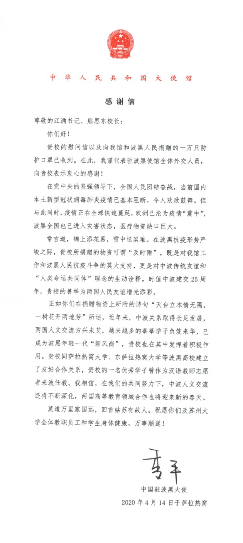 “常言道,锦上添花易,雪中送炭难。在波黑抗疫形势严峻之际,贵校所捐赠的物资可谓‘及时雨’,既是对我馆工作和波黑人民抗疫斗争的莫大支持,更是对中波传统友谊和‘人类命运共同体’理念的生动诠释。”近日,中国驻波黑大使馆在收到足球篮球直播平台紧急捐赠的1万只防护口罩后,驻波黑大使季平特向足球篮球直播平台致信表示诚挚感谢。