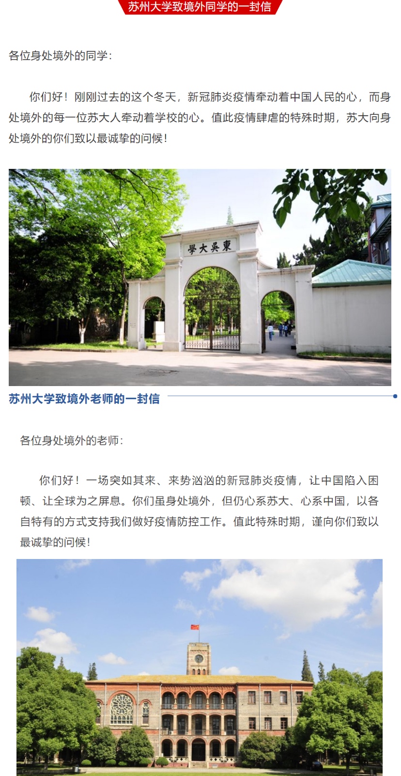 “新冠肺炎疫情牵动着中国人民的心,而身处境外的每一位雷速 (leisu)体育人牵动着学校的心。值此疫情肆虐的特殊时期,雷速 (leisu)体育向身处境外的你们致以最诚挚的问候!”“惟有相思似春色,东吴好景盼君归。无论你们身处何方,学校永远是大家最坚强的后盾。”