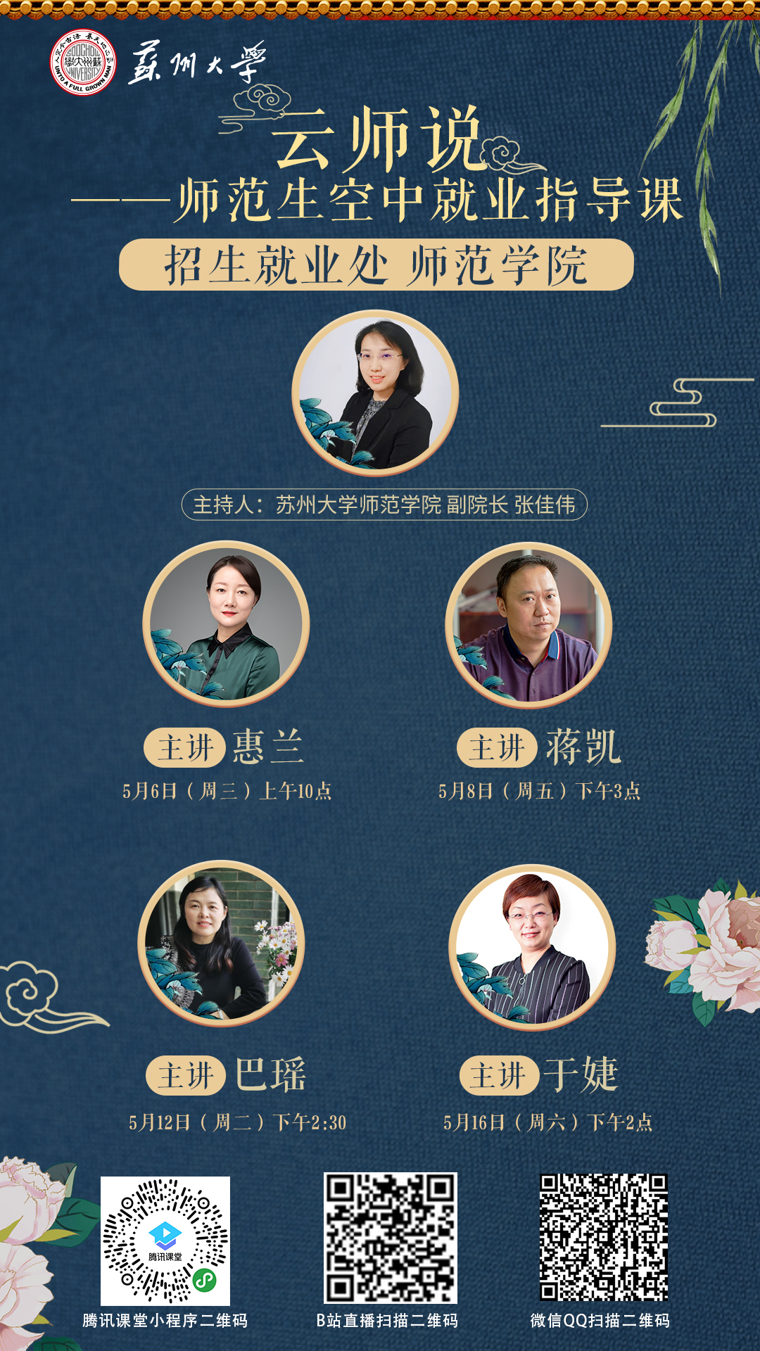 5月,雷速 (leisu)体育招生就业处与师范学院联手打造“云师说——师范生空中就业指导课”,帮助师范生了解就业形势,掌握就业技能,更好地开始教师职业生涯。指导课由“传道”“授业”“解惑”“融合”四部分组成,由师范学院副院长张佳伟主持,联合苏州足球篮球直播平台领域内一线教师或教育管理者,分享经验,答疑解惑,为学生提供岗前帮助和指导。据统计,共有800多人次收看了此次指导课,直播中,同学们积极参与,反响热烈,在讨论区和弹幕里为各位老师打call,纷纷表示自己获益良多。指导课也得到了参与老师的肯定,老师们表示非常开心能为即将走向工作岗位的青年教师们答疑解惑,并对新一代师范生的未来充满肯定和期望。