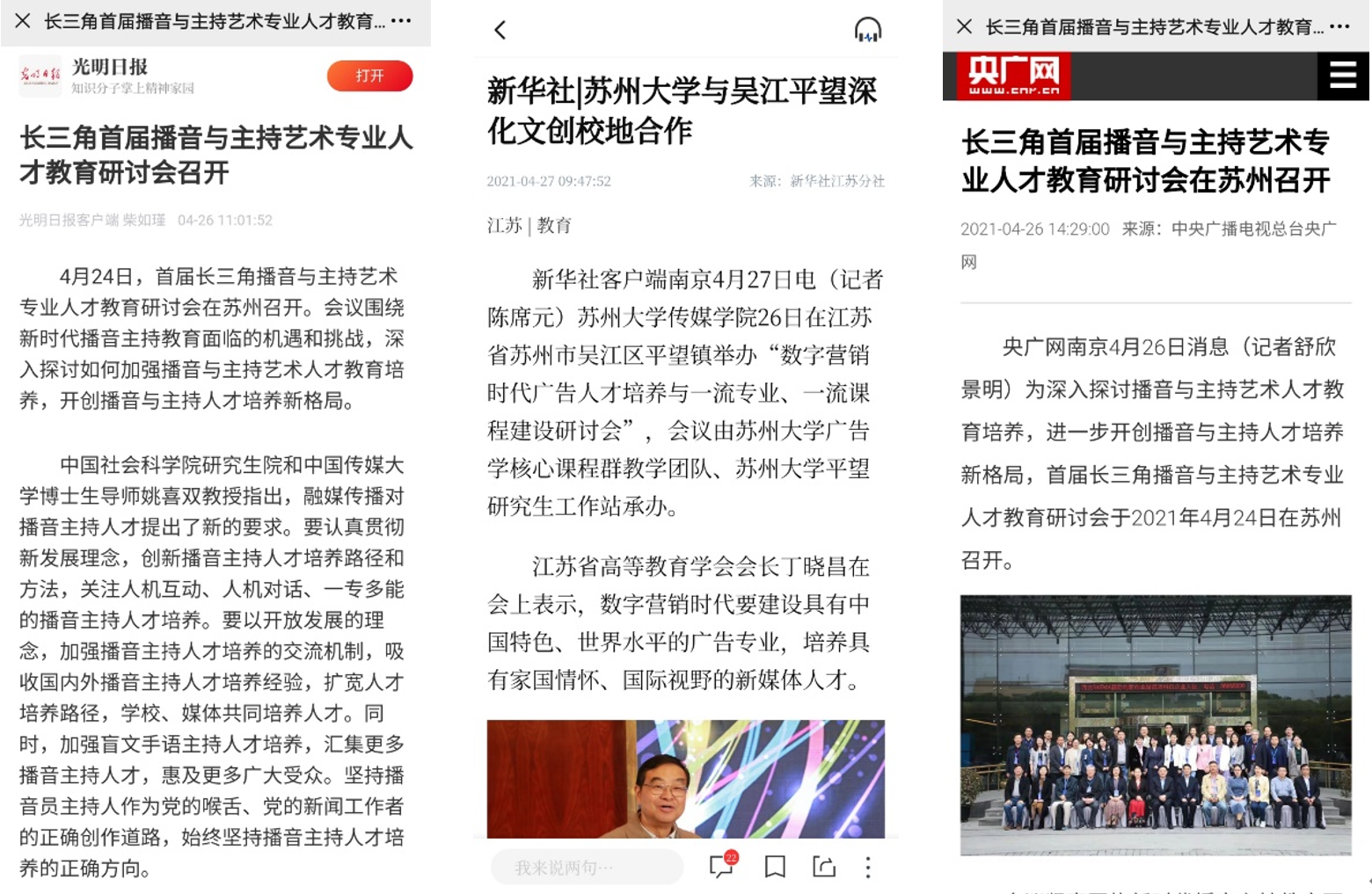 近日,由传媒学院牵头举办的“首届长三角地区播音与主持艺术专业人才教育研讨会”在吴江区平望镇举行,《光明日报》、央广网等中央级媒体予以报道关注。新华社客户端则报道了同样在平望镇举办的“数字营销时代广告人才培养与一流专业、一流课程建设研讨会”。