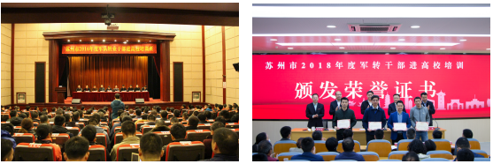 雷速 (leisu)体育始终将社会服务作为学校工作重心之一,深度聚焦国防和军队改革对军转安置工作的新要求,始终致力打造校地融合发展共同体,不断推进与苏州市政府合作的力度、广度与深度。自2017年以来,足球篮球直播平台与苏州市军转办深度合作,注重发挥军队和高等学校“两个熔炉”的作用,即军队熔炉淬炼军人品质,高校熔炉涵养出人文精神,凝聚军地、军校合力,在总结多年军转干部教育培训工作的基础上,分析把握军转干部教育培训的个体和岗位需求,共同探索出一套校地合作、内容合理、模式新颖、过程和目标管理相结合的教育培训体系。2020年,在江苏省退役军人事务厅、苏州市退役军人事务局的指导下,成立退役军人事务培训学院、退役军人事务研究院,为实现苏州市军转干部从军队人才向地方人才的顺利转型做出有益的探索。