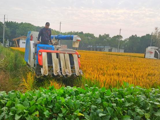 收割机的声音在旁边传来,刚割好的稻谷顷刻间变成了车斗里哗哗作响的谷粒,大家为丰收的景象感到快乐,赞叹科技的进步给人类生活生产带来的便利。