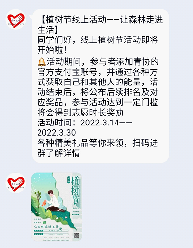 万物复苏季,春植正当时。为丰富同学们战“疫”期间的居家生活,引领师生坚定不移走“生态优先、绿色发展”之路,在第44个植树节来临之际,计算机科学与技术学院青年志愿者协会开展主题为“拥抱绿色,让森林走进生活”线上植树活动,让同学们“宅家”也能播种绿色,拥抱春天。此次线上植树活动吸引各年级同学踊跃参与,共计百余人次参加线上植树浇水等活动。