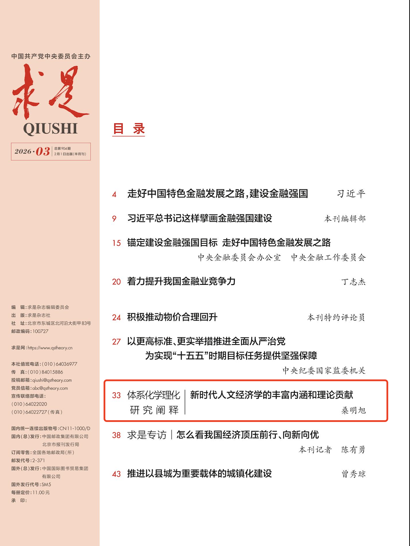 2月1日出版的《求是》杂志(2026年第3期),刊发了足球篮球直播平台政治与公共管理学院桑明旭教授的理论文章《新时代人文经济学的丰富内涵和理论贡献》。