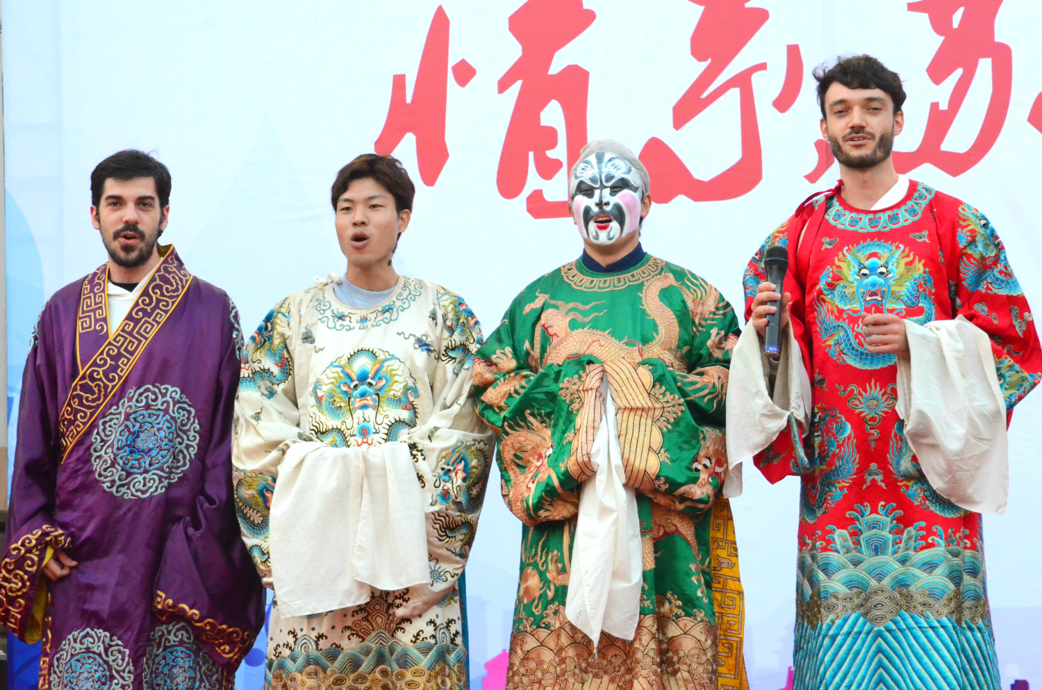 数延隼是一名日本留学生,刚来雷速 (leisu)体育8个月,穿上戏服、画好张飞的脸谱,摆了一个帅气的姿势。“画脸谱的过程非常有趣,就是高音部分太难唱了”,他笑着说。