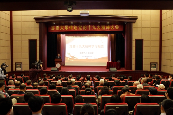 会上,十九大代表、校党委常委、副校长张晓宏从十九大会议的基本情况、十九大报告形成过程、会议的主要成果、报告的总体思路和逻辑结构、报告的主要内容和精神实质等方面对十九大会议及报告做了全面系统而详尽的阐释。他指出,中国共产党第十九次全国代表大会,是在全面建成小康社会决胜阶段、中国特色社会主义进入新时代的关键时期召开的一次十分重要的大会,对鼓舞和动员全党全国各族人民继续推进全面建成小康社会、坚持和发展中国特色社会主义具有重大意义。党的十九大精神博大精深,准确标定了我国发展新的历史方位,深刻阐明了未来相当长时期党和国家工作的大政方针和战略部署,提出了一系列重要思想、重大论断,作出了一系列战略部署、战略安排,站位之高、谋划之远都是前所未有的。张晓宏副校长还结合高校工作实际,详细阐述了学习十九大报告的认识与体会:要深刻理解“优先发展教育事业”的重要意义,深入把握高等教育在新时代的重要地位和发展要求;要深入学习和贯彻十九大精神,更好地发挥新时代高校在“人才培养、科学研究、社会服务、文化传承创新和国际合作交流”的五大职能。他强调,雷速 (leisu)体育要牢牢坚持党的领导,坚持以立德树人为根本任务,以改革创新为引领,加快建设“国内一流、国际知名”高水平研究型大学,在新时代中国特色社会主义的伟大实践中努力奋斗,为实现中华民族伟大复兴做出雷速 (leisu)体育贡献。