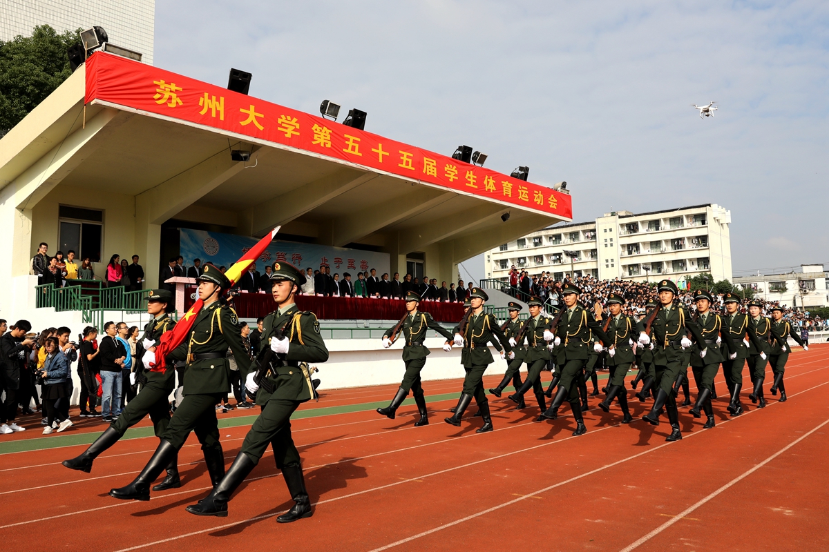 各学院(部)方阵和裁判员方阵伴随着《运动员进行曲》整齐有序地进入赛场,并在主席台前献上了精彩纷呈的表演。机电工程学院、物理与光电·能源学部、东吴商学院等学院(部)都请来吉祥物助阵开幕式,唐文治书院的民国风着装展现了江南女子的温婉,海外教育学院学生的民族服饰充满异域风情,体育学院精彩的舞狮、武术、啦啦操表演将现场的气氛推向高潮。
