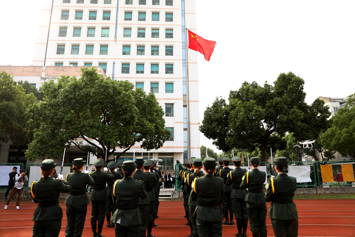 随后,国旗班随着庄严的进行曲进入赛场,他们的动作整齐划一、步伐铿锵有力、神情庄严坚定。在全场师生的注目中,鲜艳的五星红旗在空中飘扬。