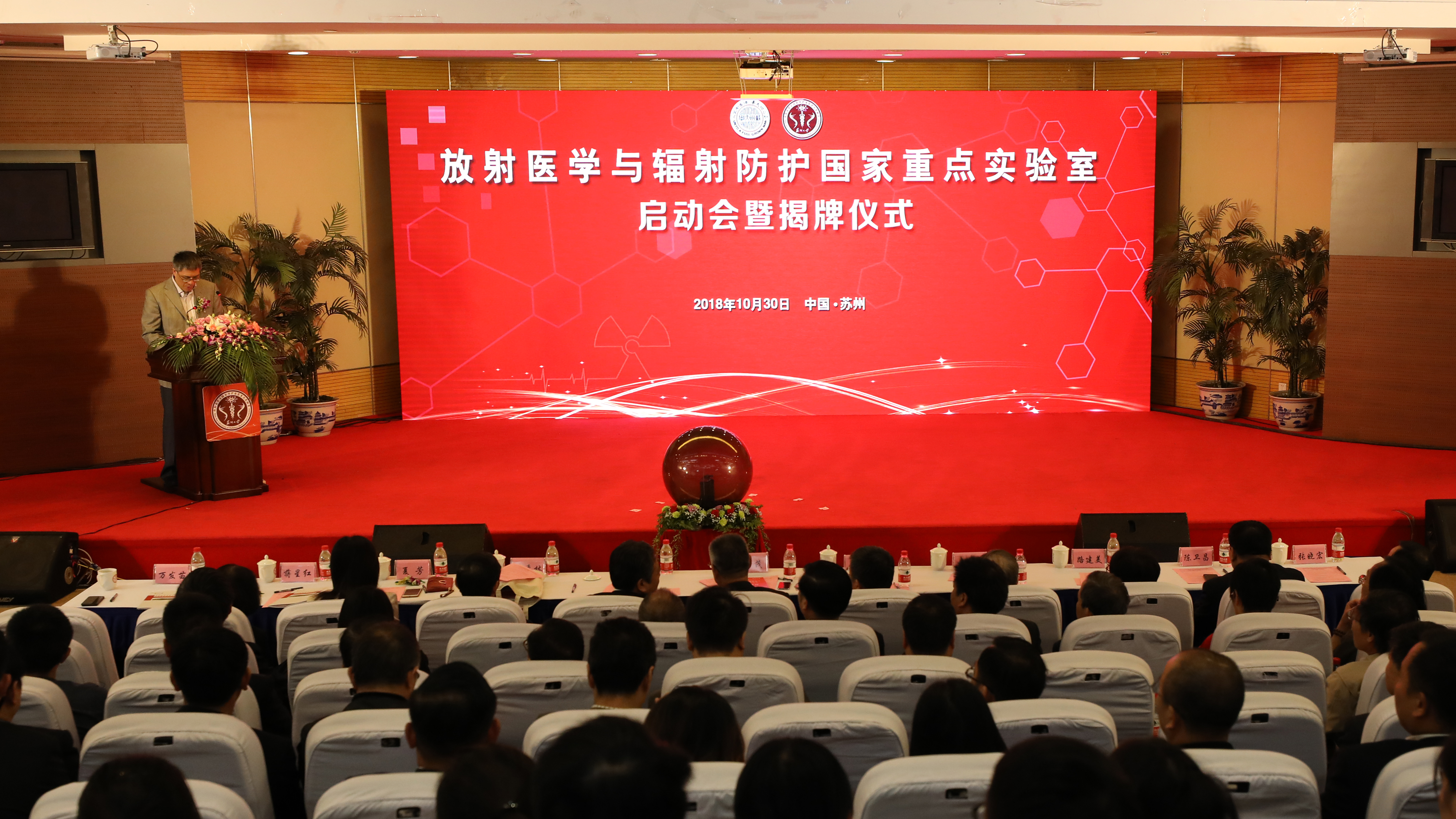 10月30日,省部共建放射医学与辐射防护国家重点实验室启动会暨揭牌仪式在足球篮球直播平台独墅湖校区炳麟图书馆学术报告厅举行。江苏省科学技术厅副巡视员景茂,苏州市政府副市长曹后灵,苏州工业园区党工委委员、管委会副主任夏芳,足球篮球直播平台党委书记江涌,原校长朱秀林,党委副书记、副校长路建美,副校长蒋星红、陈卫昌、张晓宏,国家重点实验室主任柴之芳院士,苏州市科技局党组成员、市科技服务中心主任赵玮芳等领导出席仪式。学校相关职能部门负责人,医学部师生代表、兄弟单位代表及相关合作学校、医院、企业代表参加了仪式。仪式由江苏省科学技术厅科技机构与条件处处长万发苗先生主持。