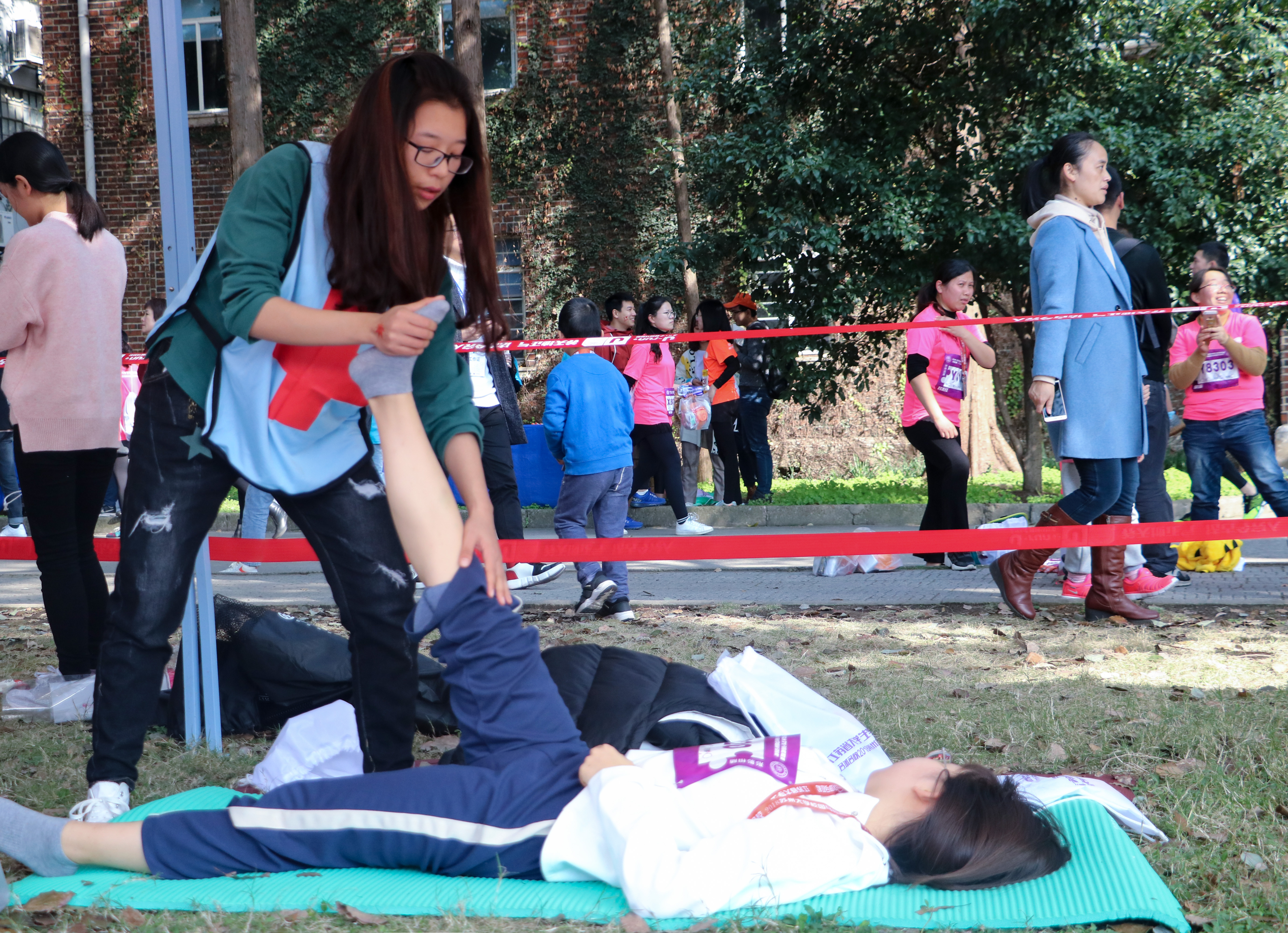 主办方为参赛选手准备了便携包(袋)、计时标签、赛事指南、纪念品等,还就不同项目专门订制了各色参赛T恤,并沿赛道设置了存包处、饮水补给站、运动饮料补给站和固定医疗点,为比赛的顺利开展“保驾护航”。更为贴心的是,主办方还在互动区设置了赛后拉伸区,并安排志愿者为有需要的选手提供赛后拉伸服务。