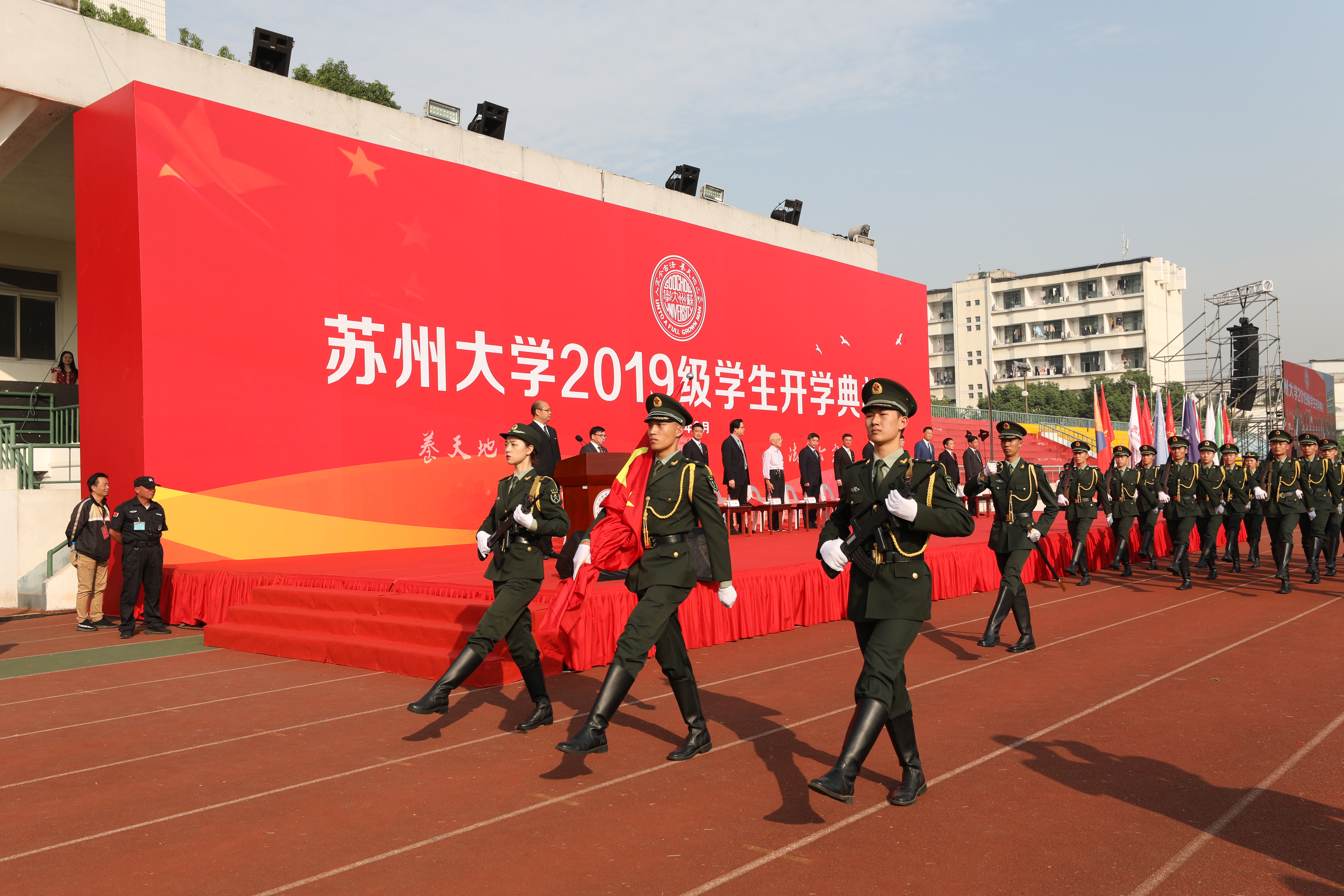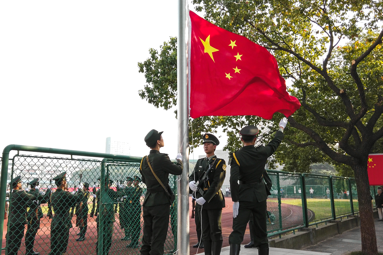 国旗班昂首挺胸,踏着整齐划一的步伐护送国旗入场,全体师生齐声奏唱国歌,五星红旗缓缓升起,开学典礼在庄严雄壮的国歌声中正式拉开帷幕。