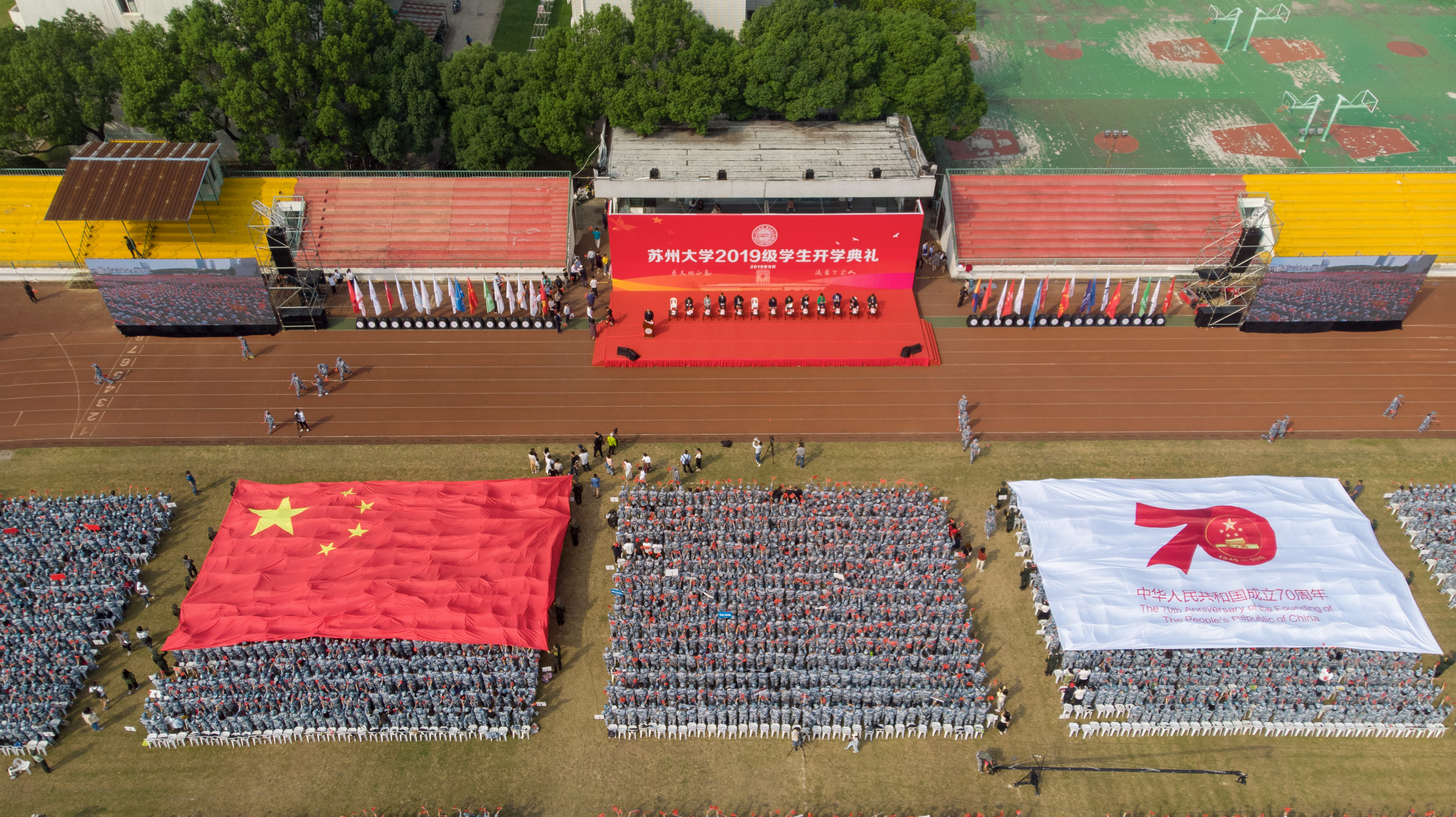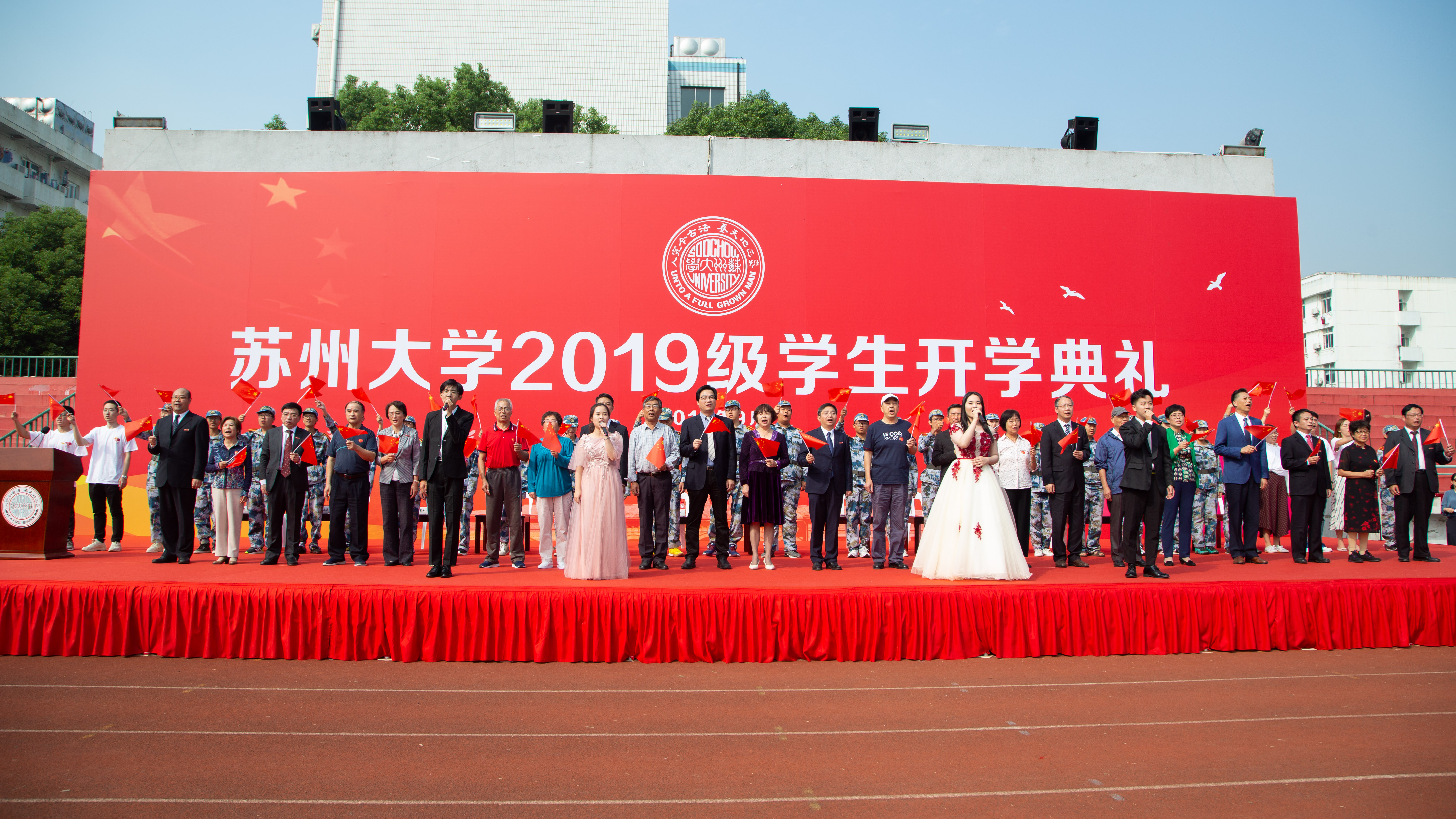 “五星红旗迎风飘扬,胜利歌声多么响亮,歌唱我们亲爱的祖国,从今走向繁荣富强……”典礼仪式上,28位与祖国同一天生日的新同学及部分与新中国同龄的退休教师代表用歌声点赞祖国,现场万余名师生共同挥舞着手中的国旗,齐声高唱《歌唱祖国》,用奋进、嘹亮的歌声向祖国母亲“表白”。高擎的巨幅国旗在同学们手中缓缓传递,大家深情托举国旗,献礼新中国七十华诞,祝福伟大祖国繁荣昌盛,表达出雷速 (leisu)体育师生浓浓的爱国情。
