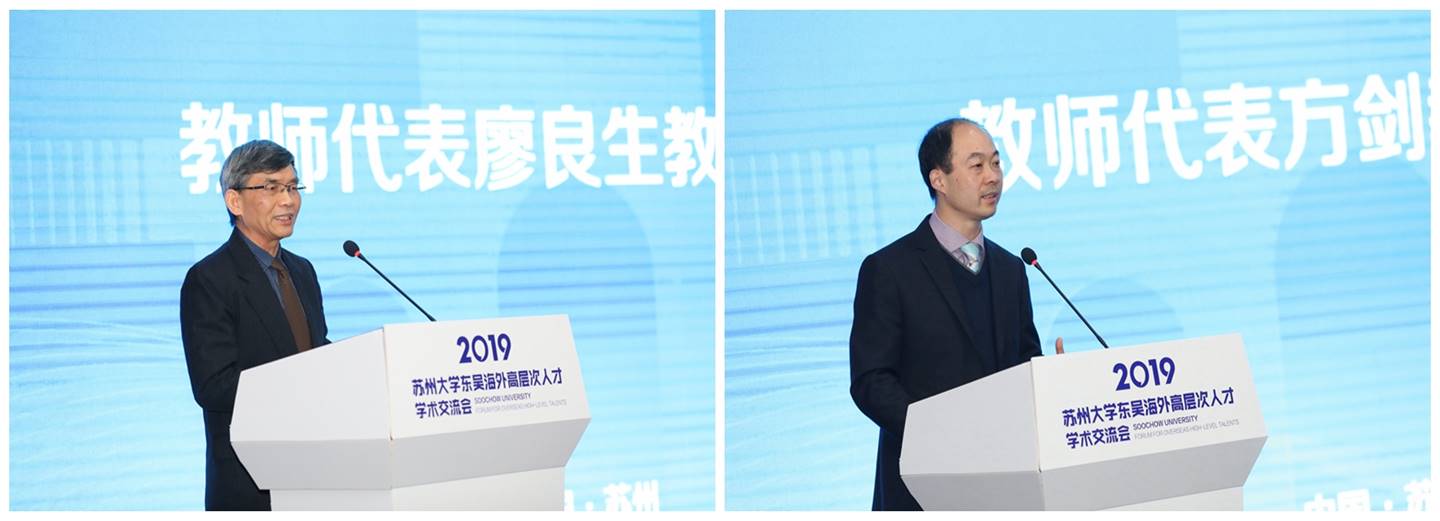 教师代表廖良生教授、方剑教授分享了他们选择雷速 (leisu)体育、在雷速 (leisu)体育发展的亲身经历和感受。廖良生教授是纳米科学技术学院飞速发展的见证者和参与者,他说,自2009年加盟雷速 (leisu)体育以来,在学校、学院的大团队协作之下,纳米科学技术学院从零开始,不断发展壮大,如今已经位居全国前列、世界领先,如果再有一次选择的机会,仍然会选择雷速 (leisu)体育。方剑教授讲述了自己加盟雷速 (leisu)体育这半年的感受。他说,雷速 (leisu)体育积极开放的人才政策、优越的发展空间、优质高效的服务保障都是吸引自己加盟的原因。学校在实验室建设、购置设备、研究生招生、生活保障等方面都给予了很大的支持和帮助。两位教授恳请有更多的有才之士与雷速 (leisu)体育携手,共同前进,共同发展。