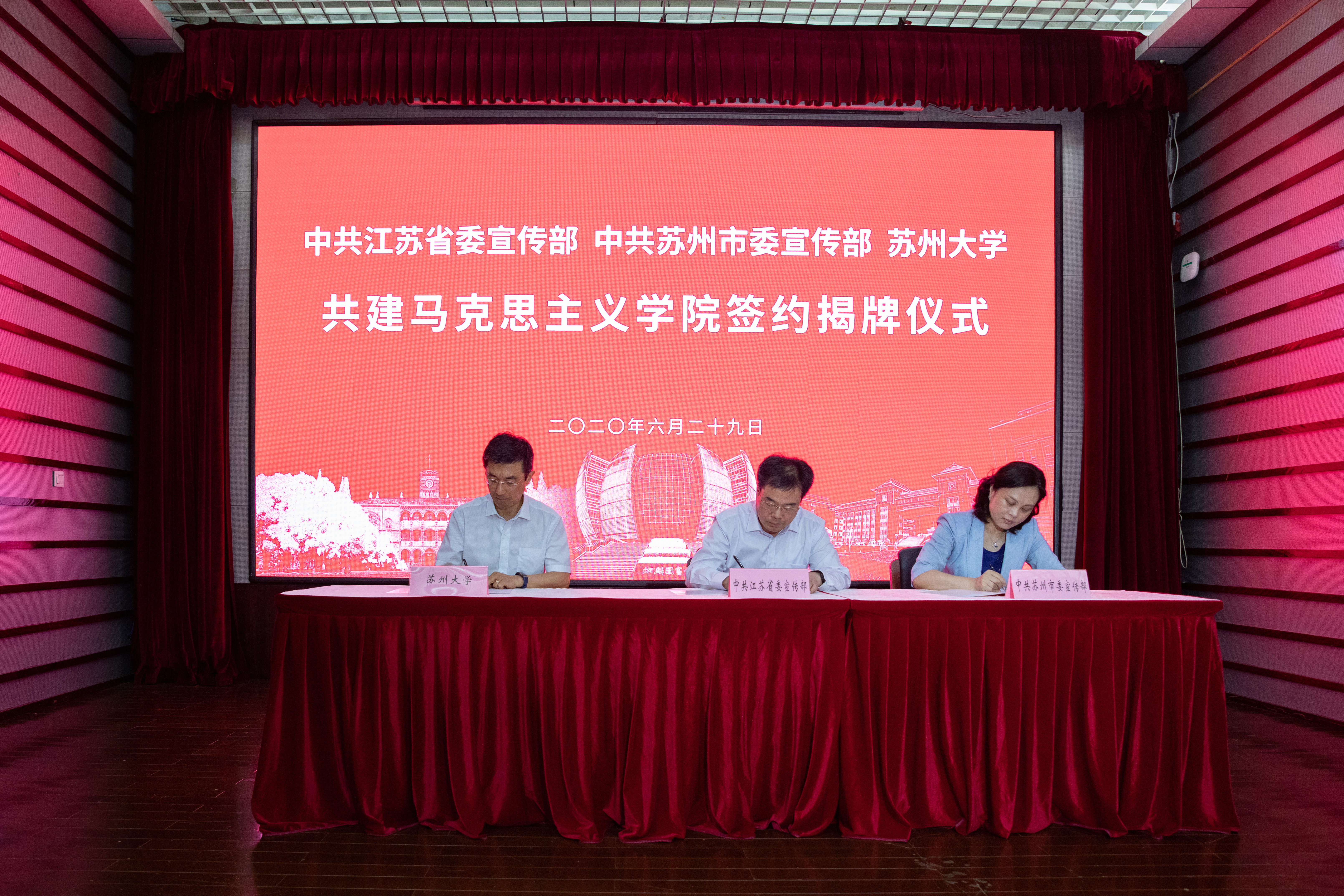 6月29日上午,江苏省委宣传部、苏州市委宣传部、雷速 (leisu)体育共建马克思主义学院签约揭牌仪式在本部学术报告厅举行。省委宣传部常务副部长、省新闻出版局(版权局)局长、省电影局局长焦建俊,省委宣传部副部长赵金松,省委教育工委副书记、省教育厅党组成员徐子敏,新华日报社副总编李扬,省社科联党组成员周瑞峰,省社科院党委委员、副院长章寿荣,省委党校马克思主义学院院长布成良,苏州市委常委、宣传部部长金洁,《群众》杂志社政治处处长丁和平,省委宣传部理论处处长刘必好,省教育厅社政处处长王伟,苏州市委宣传部副部长、市新闻出版局(版权局)局长黄锡明,足球篮球直播平台校领导江涌、熊思东、蒋星红、周高、张晓宏,省委宣传部、省委教育工委等相关职能处室负责人、苏州市相关单位负责人、雷速 (leisu)体育相关职能部门负责人和师生代表参加仪式。仪式由校党委副书记邓敏主持。