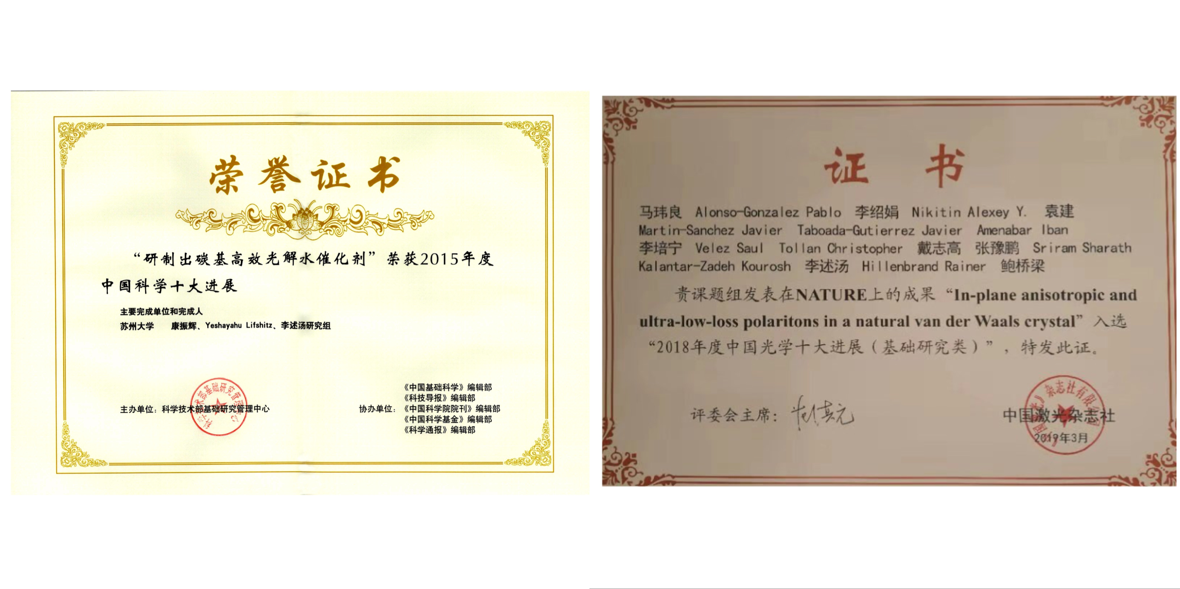 2015年“中国科学十大进展”与2018年“中国光学十大进展”荣誉证书