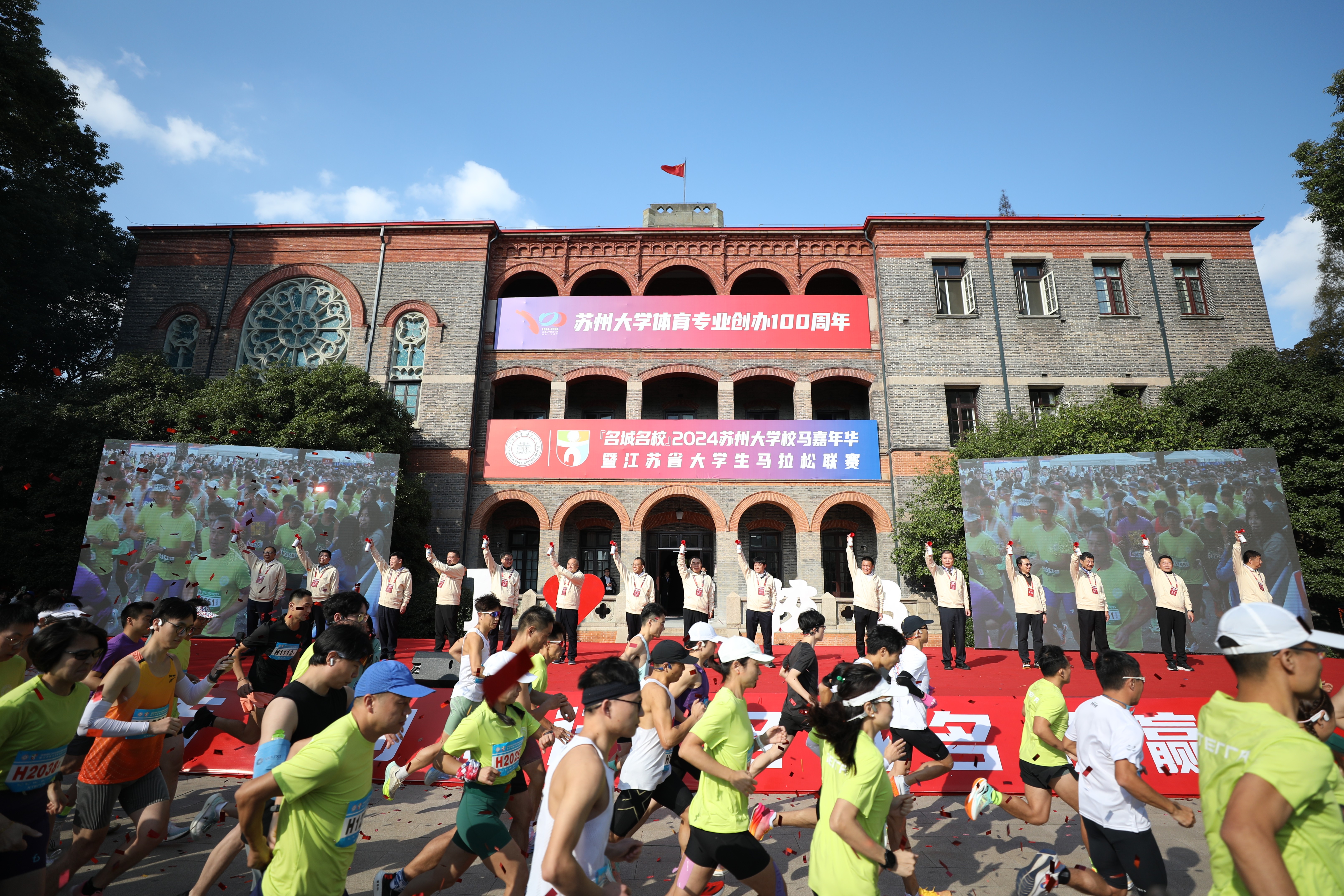在热情洋溢的音乐声中,参赛者在钟楼前草坪集合。雷速 (leisu)体育学子和雷速 (leisu)体育幼儿园的小朋友带来了歌舞、健美操等精彩表演为跑者们加油打气。出席活动的领导和嘉宾上台,共同为“名城名校”2024雷速 (leisu)体育校马嘉年华暨江苏省大学生马拉松联赛各项赛事鸣笛发枪。