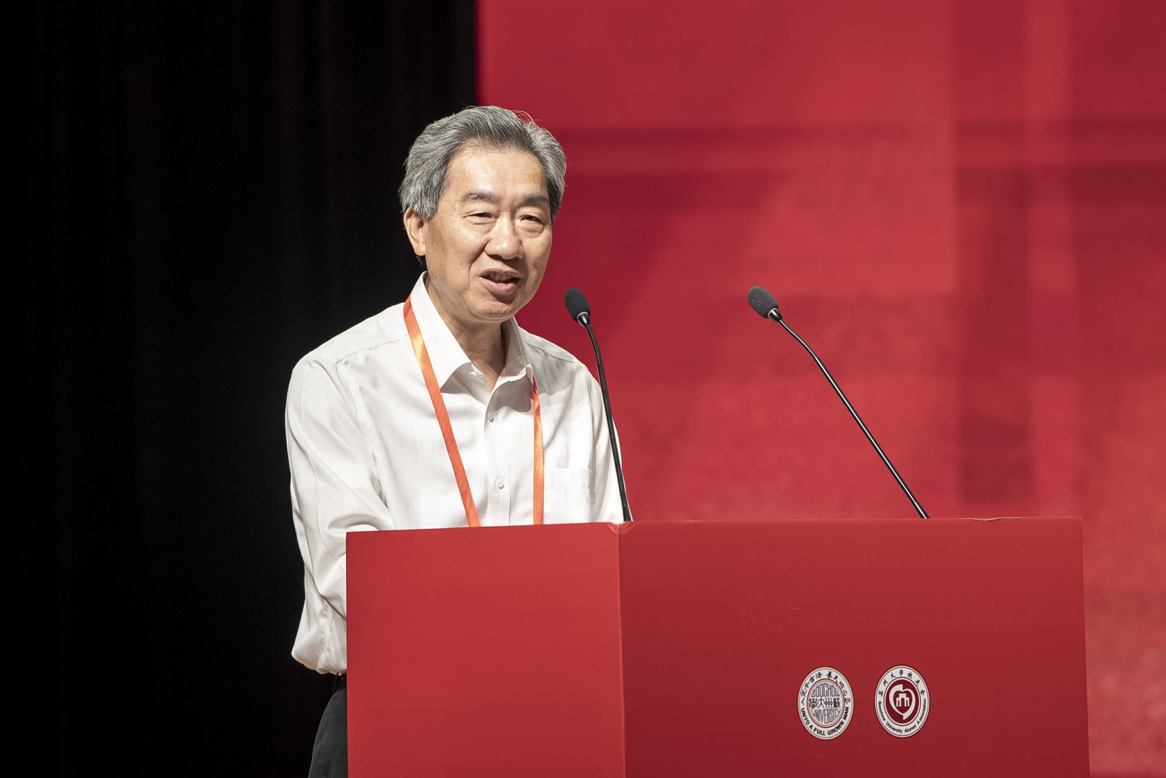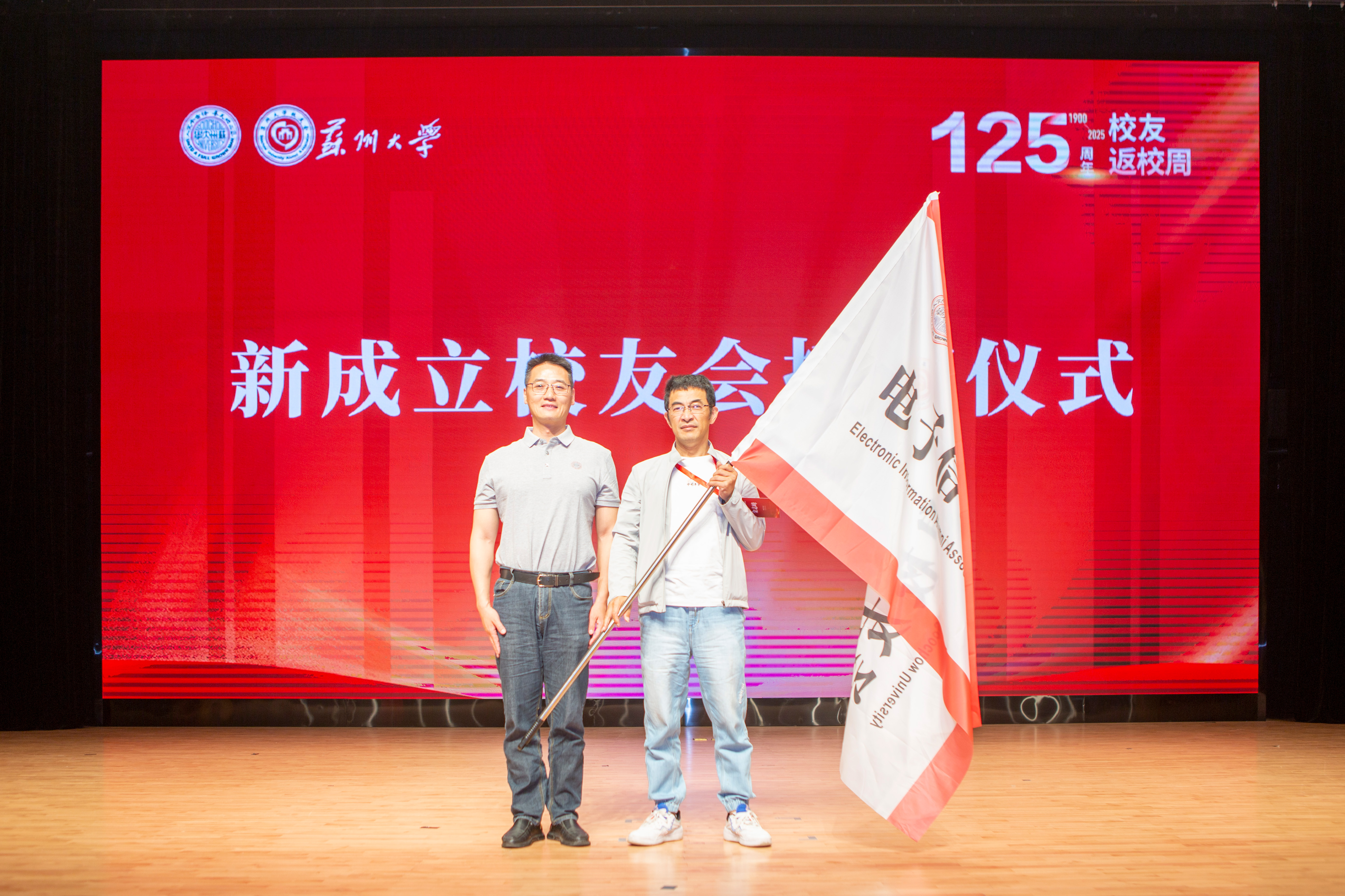会上,还举行了新成立校友会授旗仪式。程晓军为新成立的电子信息学院校友会授旗。电子信息校友会会长、苏州江南嘉捷电梯有限公司党委书记、董事长金志峰上台接旗。