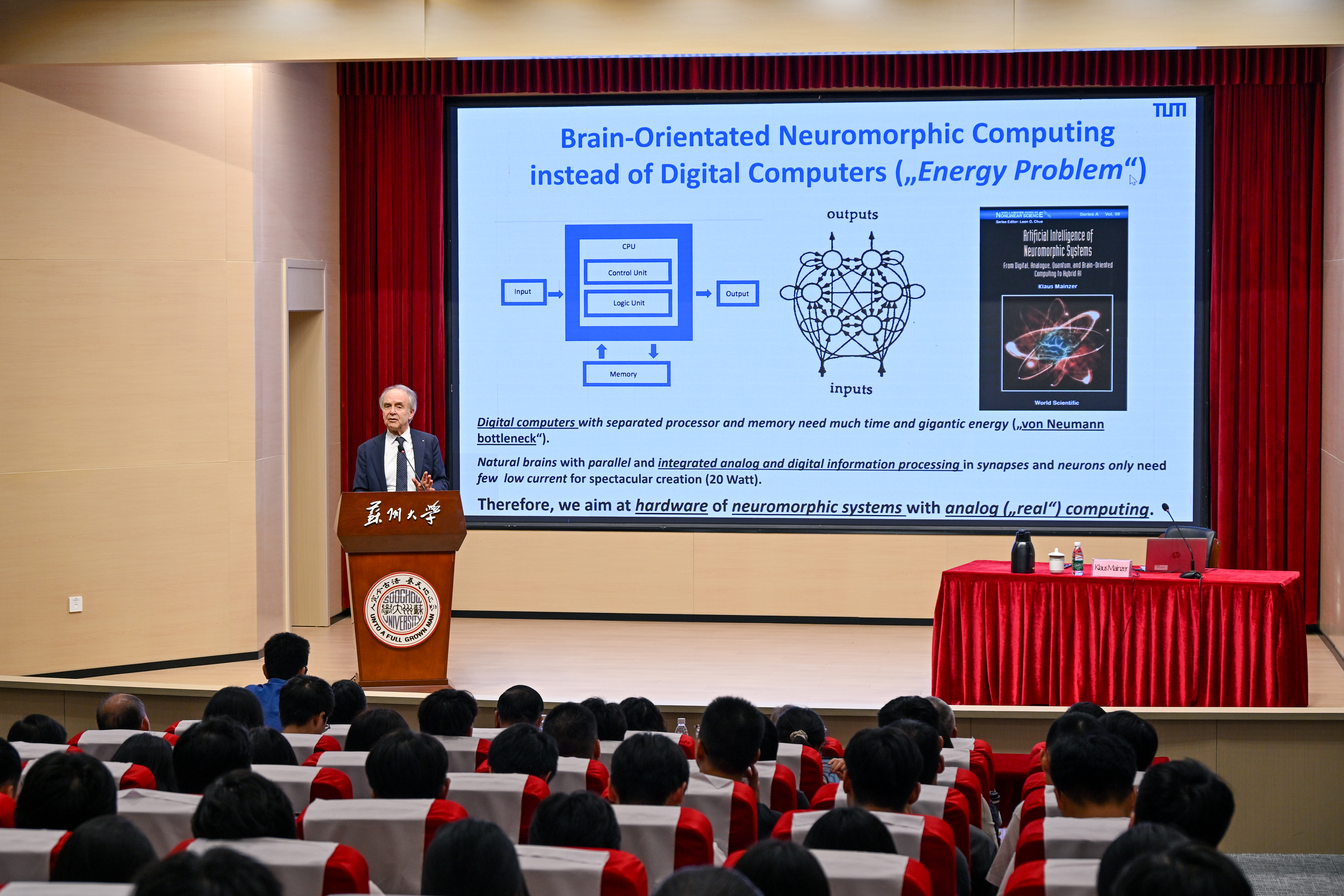 当天下午,Klaus Mainzer在红楼学术报告厅为足球篮球直播平台师生作了题为《复杂系统、人工智能与新兴技术:21世纪的创新》的学术报告,吸引了全校200余名师生到场。他从全球人工智能发展前沿切入,深入阐释了如何整合经典数字化技术、神经形态计算与量子科技,构建面向可持续发展的混合智能体系。他强调,跨学科融合与哲学思维是推动未来科技突破的关键。