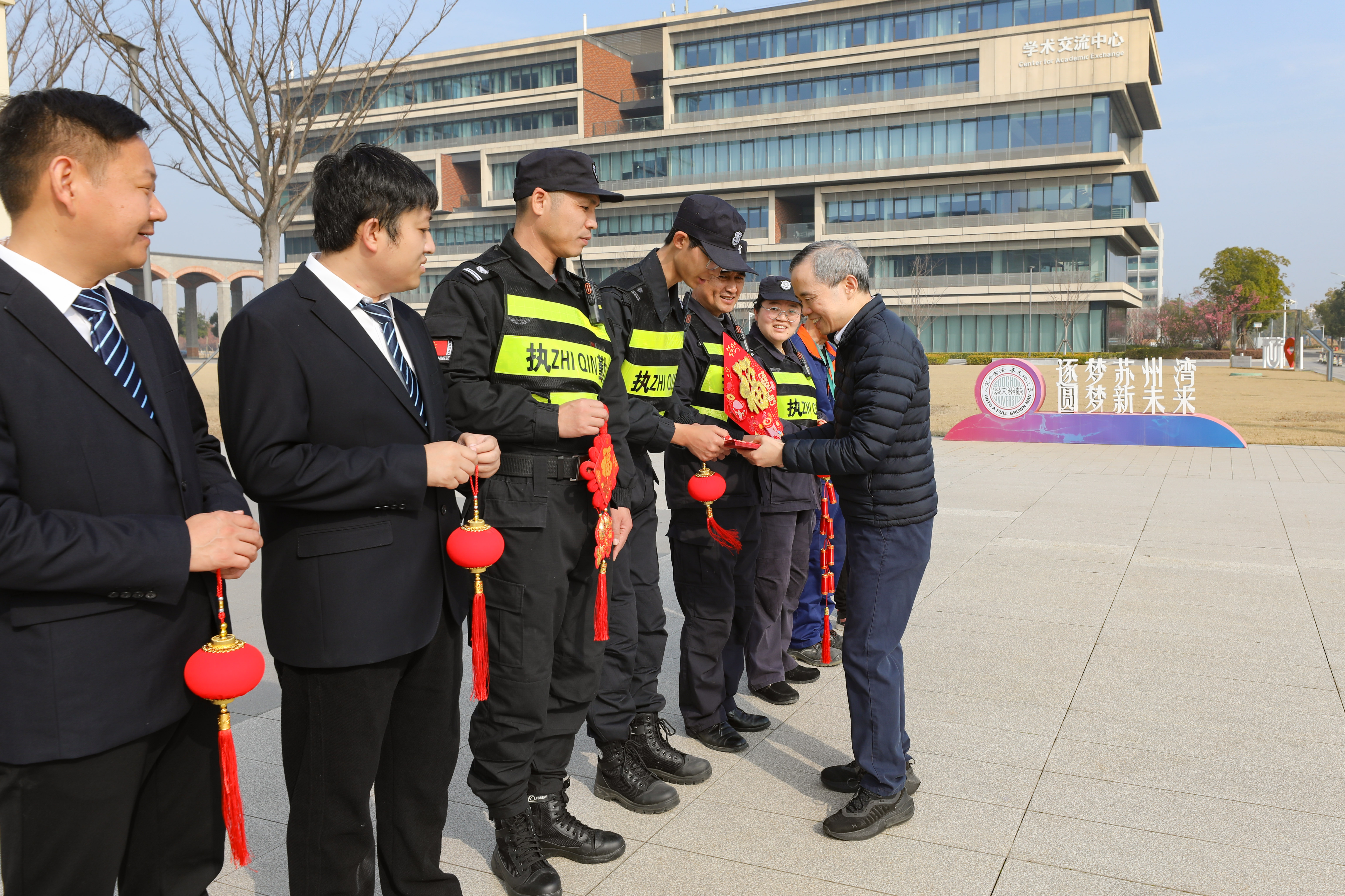 在天赐庄校区和阳澄湖校区,王云杰代表学校向一线值守员工致以亲切问候和衷心感谢。他表示,过去一年,参与服务保障的同志们始终坚持以师生为中心,付出了辛勤劳动,为学校各项事业高质量发展提供了有力支撑。希望大家在假期继续发扬爱岗敬业的精神,细致地做好校园服务保障工作,确保大家度过一个欢乐祥和、健康安全的新春假期。