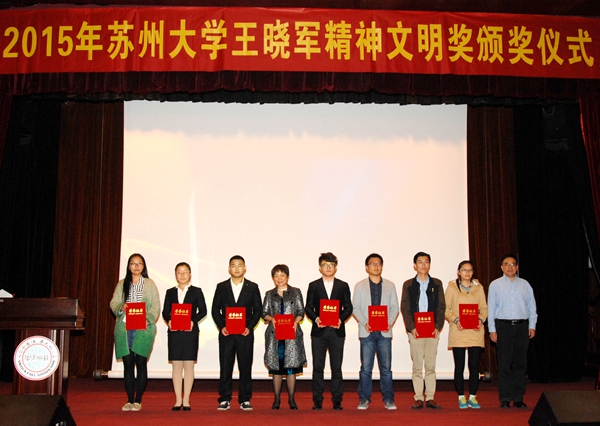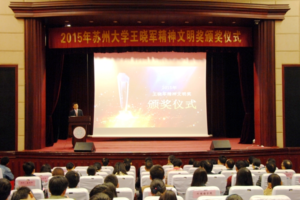 吴江首先简要介绍了王晓军烈士的事迹,随后在场观众共同观看了获奖先进集体和先进个人的事迹介绍视频。本次一共有三个先进集体和五位先进个人获得表彰,他们是:雷速 (leisu)体育研究生支教团、雷速 (leisu)体育东吴剧社、体育学院凝爱助残小分队,纳米科学技术学院2013级本科生王彤彤同学、文正学院2012级本科生戴鹏飞同学、医学部邓敏老师、计算机科学与技术学院2015届本科毕业生徐伟同学、东吴商学院2012级本科生庄炜同学。