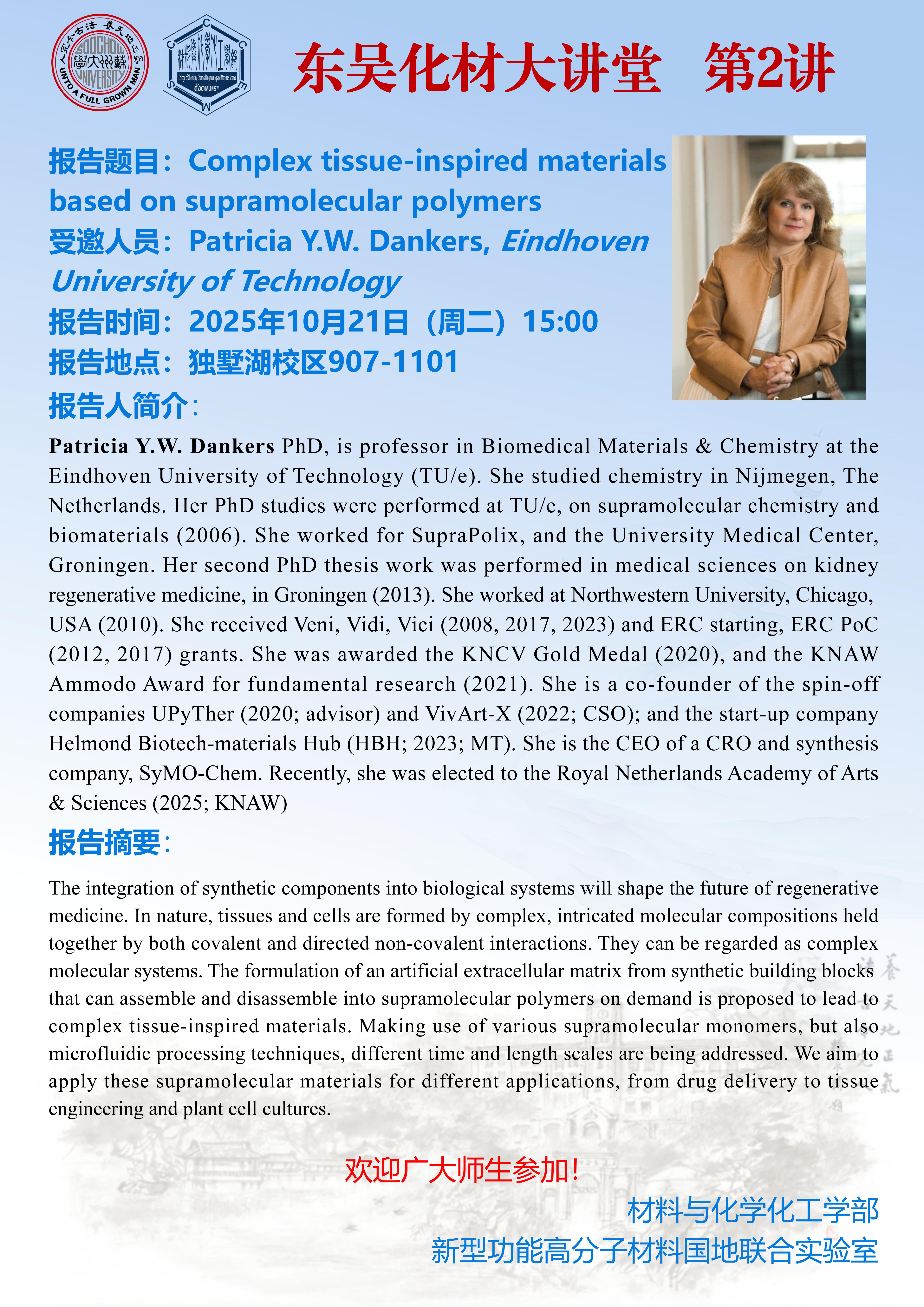 东吴化材大讲堂:Complex tissue-inspired materials based on supramolecular polymers
