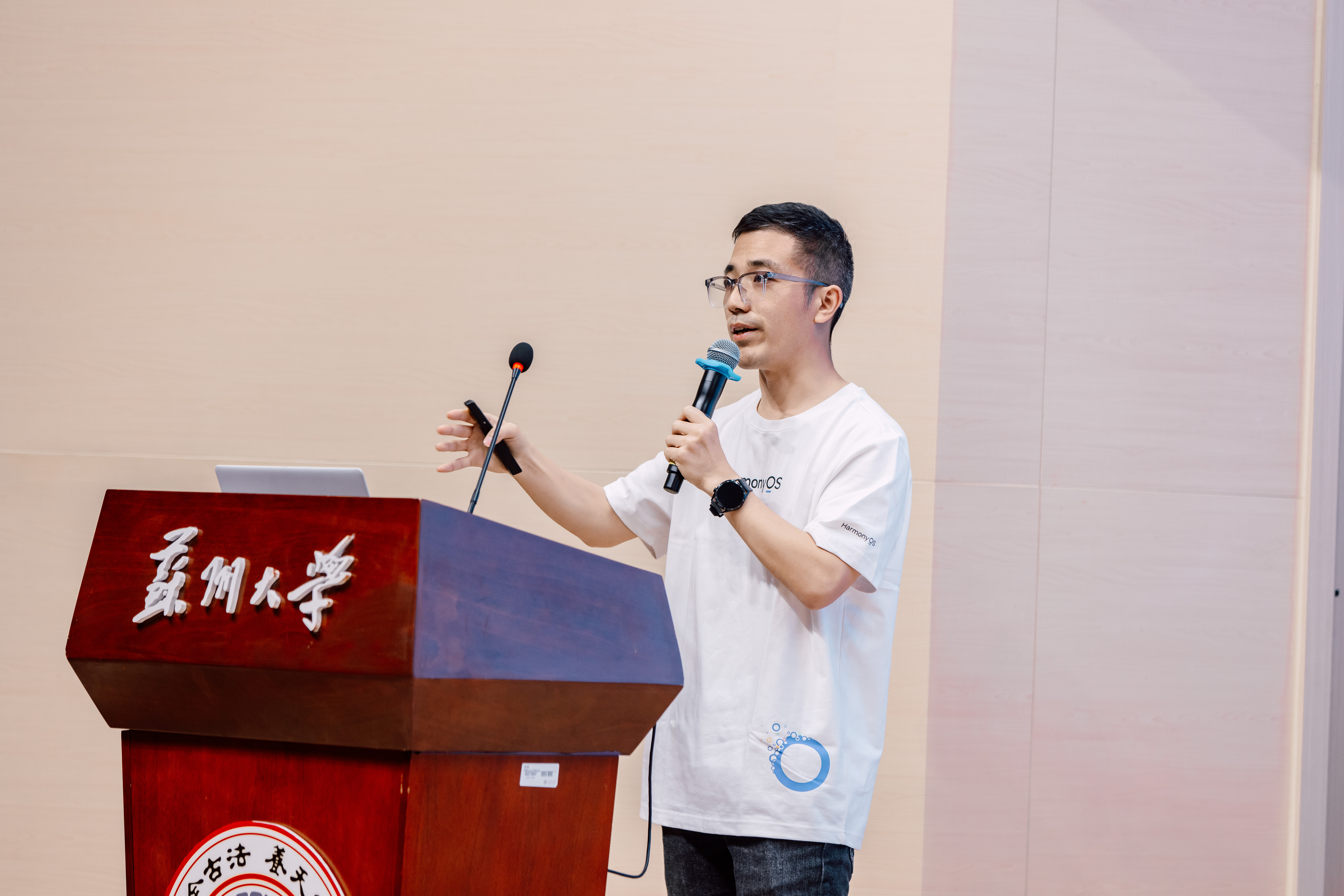 周海靖带来《创新引领未来 共建鸿蒙世界》主题报告,介绍了鸿蒙操作系统的发展背景、技术路线、体验、生态、应用开发和赋能学习等内容。他鼓励同学们积极下载使用各种开发套件,参与应用开发,共建开放生态。