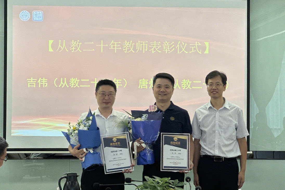 会上,学院常务副院长王进为“光荣从教二十年”的教师吉伟、唐煜颁发纪念证书。